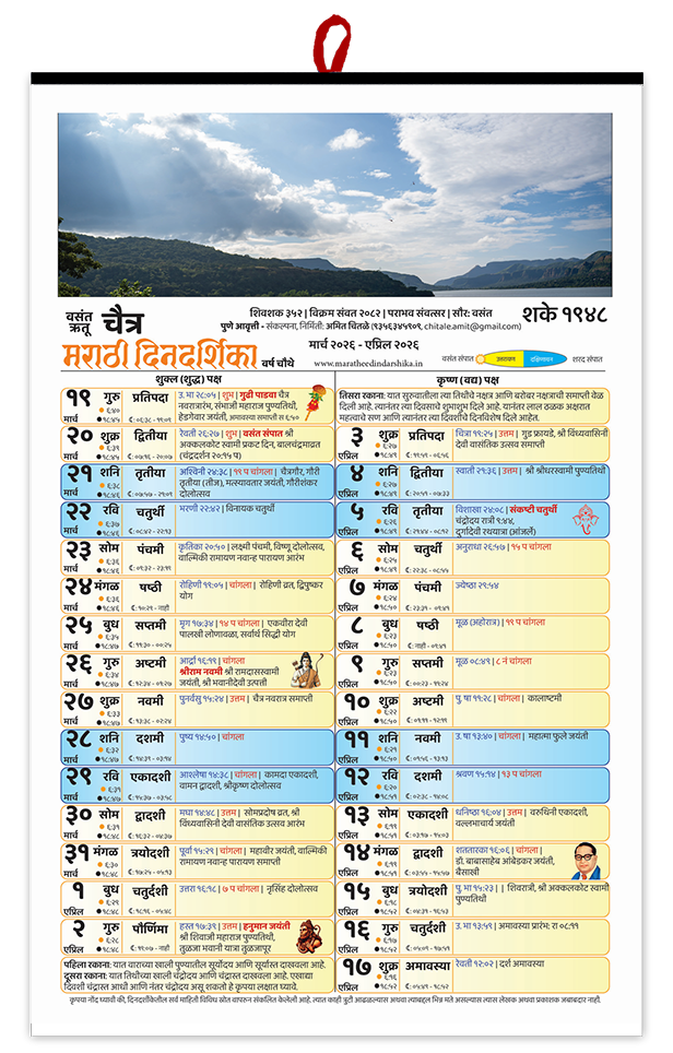 कृपया नोंद घ्यावी की ही दिनदर्शिका मराठी वर्षाप्रमाणे असल्यामुळे चैत्र ते फाल्गुन अशा महिन्यांची आहे. पुढील मराठी वर्ष हे इ.स. २०२६ मधील १९ मार्च रोजी चालू होत असल्यामुळे दिनदर्शिकांची छपाई साधारण जानेवारी २०२६ मध्ये होईल आणि फेब्रुवारी पर्यंत वितरण होईल. डिसेंबर २०२५ पर्यंत नोंद केल्यास आणि पैसे भरल्यास दिनदर्शिका सवलतीच्या किमतीत (छपाई झाल्यावर) मिळेल.