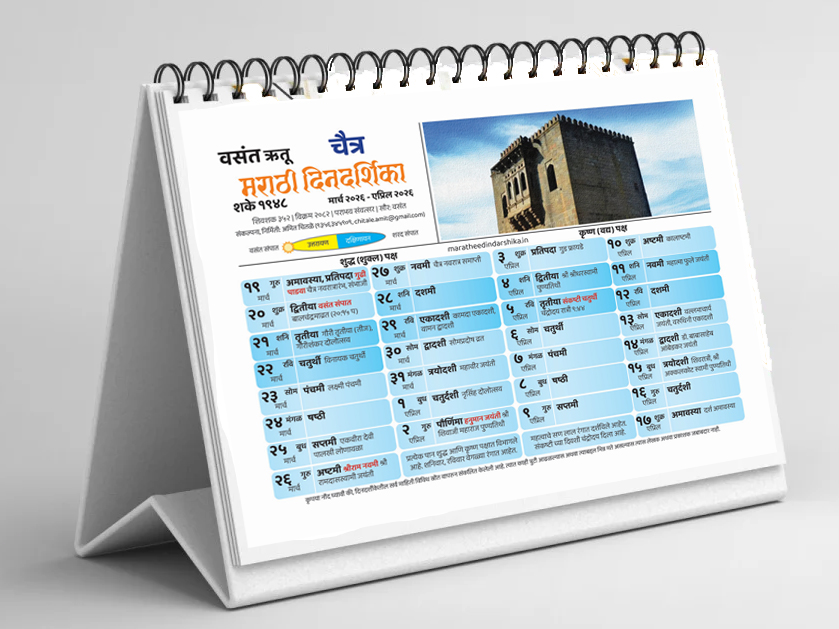 कृपया नोंद घ्यावी की ही दिनदर्शिका मराठी वर्षाप्रमाणे असल्यामुळे चैत्र ते फाल्गुन अशा महिन्यांची आहे. पुढील मराठी वर्ष हे इ.स. २०२६ मधील १९ मार्च रोजी चालू होत असल्यामुळे दिनदर्शिकांची छपाई साधारण जानेवारी २०२६ मध्ये होईल आणि फेब्रुवारी पर्यंत वितरण होईल. डिसेंबर २०२५ पर्यंत नोंद केल्यास आणि पैसे भरल्यास दिनदर्शिका सवलतीच्या किमतीत (छपाई झाल्यावर) मिळेल.